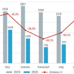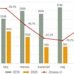 To, w jaki sposób wybuch pandemii koronawirusa wpłynął na sprzedaż nowych pojazdów użytkowych, można prześledzić, analizując dane statystyczne publikowane przez PZPM. Możliwości zestawienia danych jest wiele − przedstawiamy jedynie kilka wariantów. Na rysunku 1 zestawiono wielkość sprzedaży samochodów ciężarowych (> 3,5 t dmc.) w okresie styczeń–czerwiec dla 2019 i 2020 r. wraz ze zmianą poziomu sprzedaży rok do roku – w maju było to aż o 70,2% mniej. Widać, że najniższy poziom sprzedaży wystąpił w kwietniu, potem, wraz ze stopniowym „odmrażaniem” gospodarki, popyt powoli się zwiększał.
