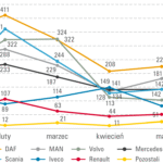 Z kolei na rysunku 2 zestawione zostały poziomy sprzedaży nowych samochodów ciężarowych z rozbiciem na poszczególnych producentów. Można powiedzieć, że koronawirus wszystkich dotknął w jednakowy sposób, przy czym po kwietniowej zapaści poszczególni importerzy z różną intensywnością rozpoczęli odrabianie strat. Warto zwrócić uwagę na bardzo dobre wyniki firmy MAN Truck & Bus, która najwyraźniej najszybciej zmobilizowała swoją organizację sprzedaży.