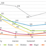 Typowym zjawiskiem jest to, że przy spadku koniunktury firmy transportowe w pierwszej kolejności odkładają na przyszłość decyzje związane z zakupem naczep i przyczep. Potwierdza to zestawienie na rysunku 3 – szczytowy spadek sprzedaży wynoszący 68,3% odnotowano w kwietniu. Podobnie jak w przypadku samochodów ciężarowych, od maja następuje stopniowy wzrost liczby zamówień. Na rysunku 4 zestawione zostały wyniki sprzedaży naczep pierwszej piątki w rankingu oraz pozostałych producentów i importerów. Warto zwrócić uwagę na duży spadek sprzedaży naczep marki Krone – wynika to z tego, że producent specjalizuje się w pojazdach wykorzystywanych w dalekobieżnym transporcie międzynarodowym (naczepy kurtynowe), a ten odnotował silną zapaść w marcu i kwietniu. Z kolei producenci oferujący np. chłodnie (wzrosło zapotrzebowanie na transport żywności w temperaturach kontrolowanych), wywrotki (nie wstrzymano większości inwestycji infrastrukturalnych) czy zabudowy wykorzystywane w zestawach operujących w transporcie krajowym mogli częściowo zrekompensować straty związane ze spadkiem zapotrzebowania na „międzynarodówkę”.