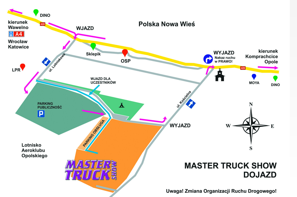 Teren zlotu, to: AUTODROM DELTA – Lotnisko Aeroklubu Opolskiego, Polska Nowa Wieś, Gmina Komprachcice, Kod pocztowy: 46-070